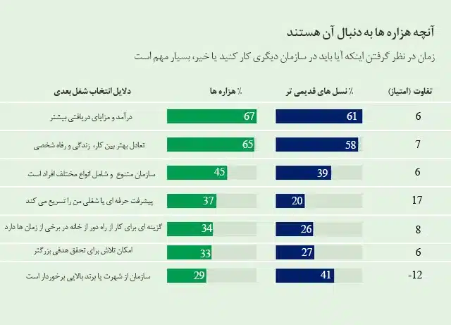 در مقایسه با نسلهای قدیمیتر، هزارهها بیشتر به دنبال پیشرفت شغلی (با 17 درصد) و بیشتر به دنبال کار از راه دور (با هشت درصد) و تعادل بیشتر کار و زندگی و رفاه بهتر (با هفت درصد) هستند.