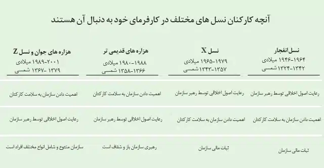 یادآوری: Gen X و Baby Boomersها نیز اخلاق را بسیار مهم ارزیابی میکنند. در واقع اخلاق، ویژگی ممتازی است که آنها در یک کارفرما میخواهند. یک سوال قابل تامل این است که نسلهای مختلف چگونه اخلاق را متفاوت میبینند؟
